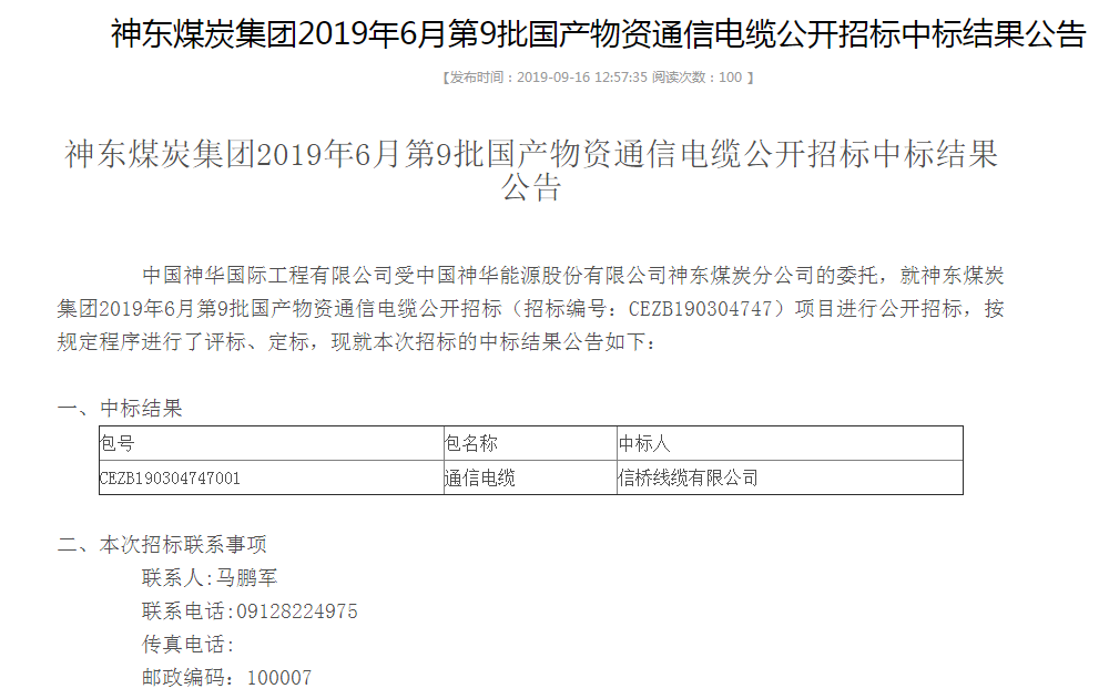 點擊數:62192019-11-21 00:00:00 來源: 神東煤炭集團2019年6月第9批國產物資通信電纜公開招標中標結果公告